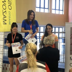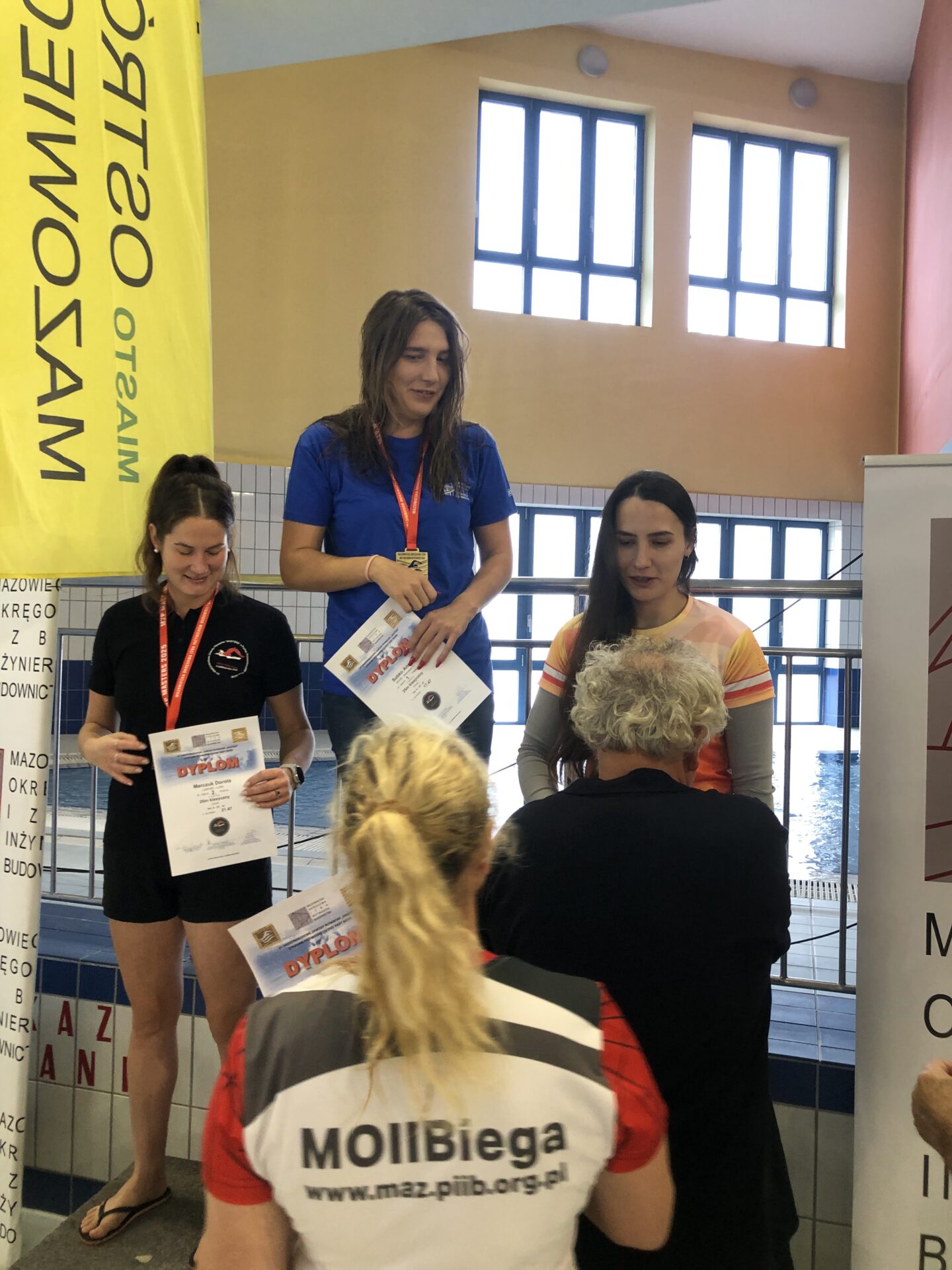 Nasza koleżanka – Anna Sobko (DOŚ/IS/0193/23) – jako reprezentantka DOIIB wzięła udział w XV Międzynarodowych Zawodach Pływackich „MASTERS” o Puchar Przewodniczącego Rady Mazowieckiej Okręgowej Izby Inżynierów Budownictwa i zdobyła dwa złote medale w stylu klasycznym i dowolnym na dystansie 25 metrów. Zawody odbyły się w dniu 4.10.2025 r.