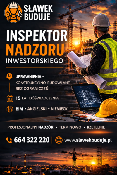 Prowadzę działalność Sławek Buduje jako inżynier z 15-letnim doświadczeniem w nadzorze inwestorskim. Posiadam uprawnienia budowlane konstrukcyjno-budowlane bez ograniczeń oraz uprawnienia SEP. Brałem udział w realizacjach m.in. dla Budimex, Porr, Bilfinger Infrastructure, Suez, Orlen i PKGIK Turów. Oferuję usługi jako inspektor nadzoru inwestorskiego oraz kierownik budowy. Działam głównie na terenie Dolnego Śląska i okolic Jeleniej Góry, z możliwością dojazdu. Korzystam z BIM, posługuję się językiem angielskim i niemieckim.